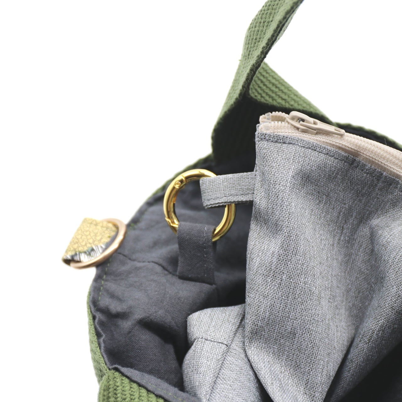 ・カラビナで取り外し可能なポーチを付けたトートバッグです。