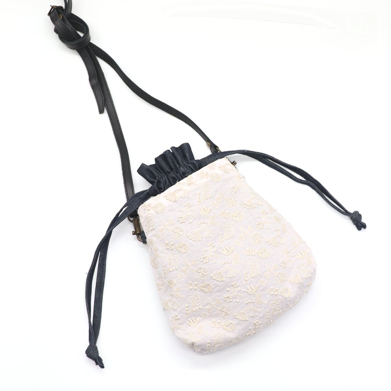 ・土台にデニム生地を使用した、実用性の高い巾着ポシェットです。