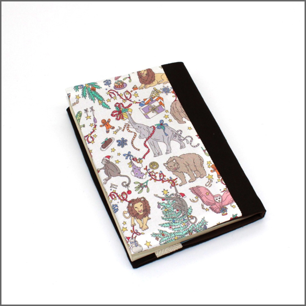 ・表地に2018年にリバティロンドン限定で販売されたクリスマスデザイン『Liberty Christmas リバティクリスマス』を使用しています。ゾウ、クマ、ライオン、フクロウ、カエル、サル…様々な動物たちが、クリスマスの夜に賑やかに動き出している様子がとっても可愛く描かれています。