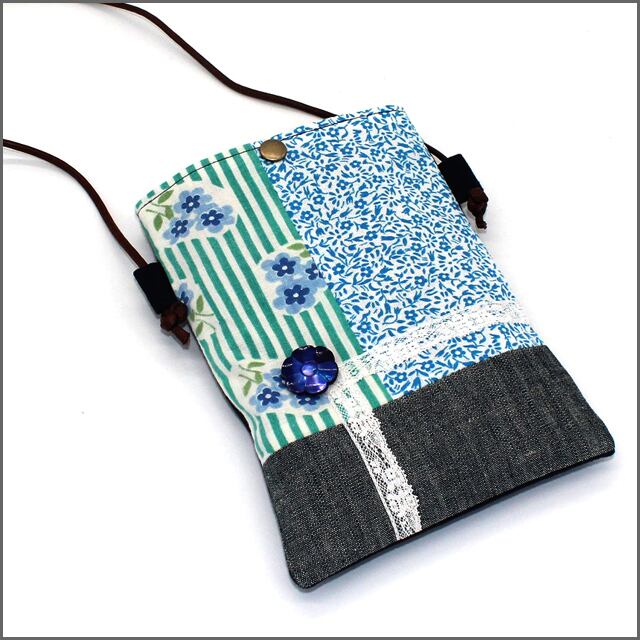 04スマホショルダー ヴィンテージファブリック 【青いお花】