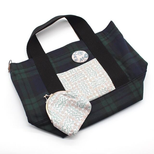 ・バッグとミニがま口はリバティとミナペルホネンのコラボプリント【Sleeping Rose スリーピング・ローズ】を使用しています。
