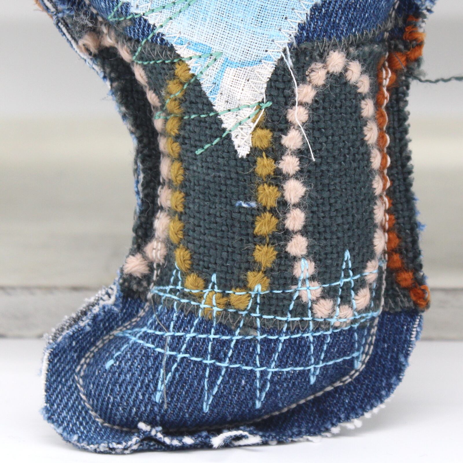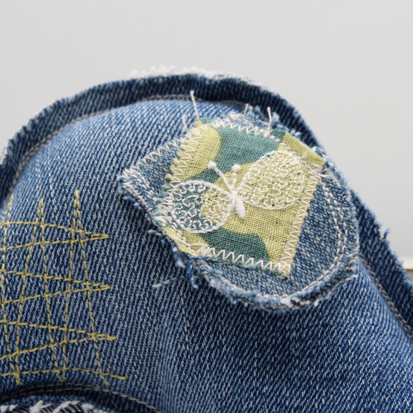 ・生地の質が違うデニムをはぎ合わせていますので、個体ごとにサイズが多少異なります。