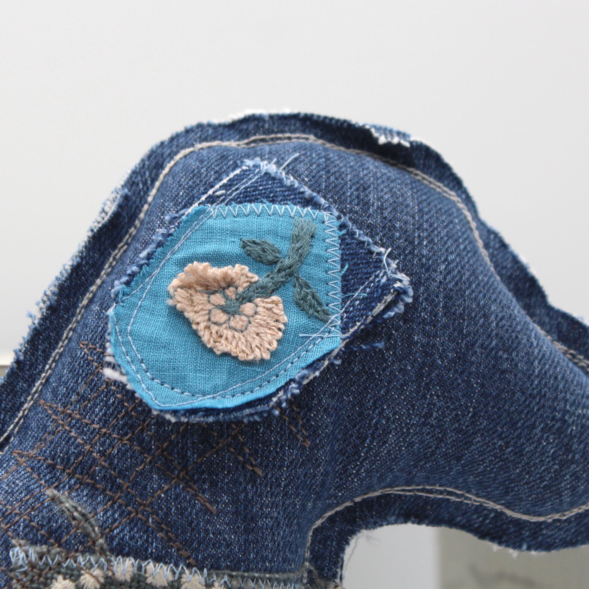 ・デッドストックのデニムをパッチワークし、ミナペルホネン、もしくはリバティとミナペルホネンのコラボ柄のはぎれ、ミナペルホネンのデザイナー皆川明氏がチェック&ストライプのネットショップ20周年記念に提供したデザインのはぎれをミシンでパッチワークした、世界でたったひとつのわんこクッションです。